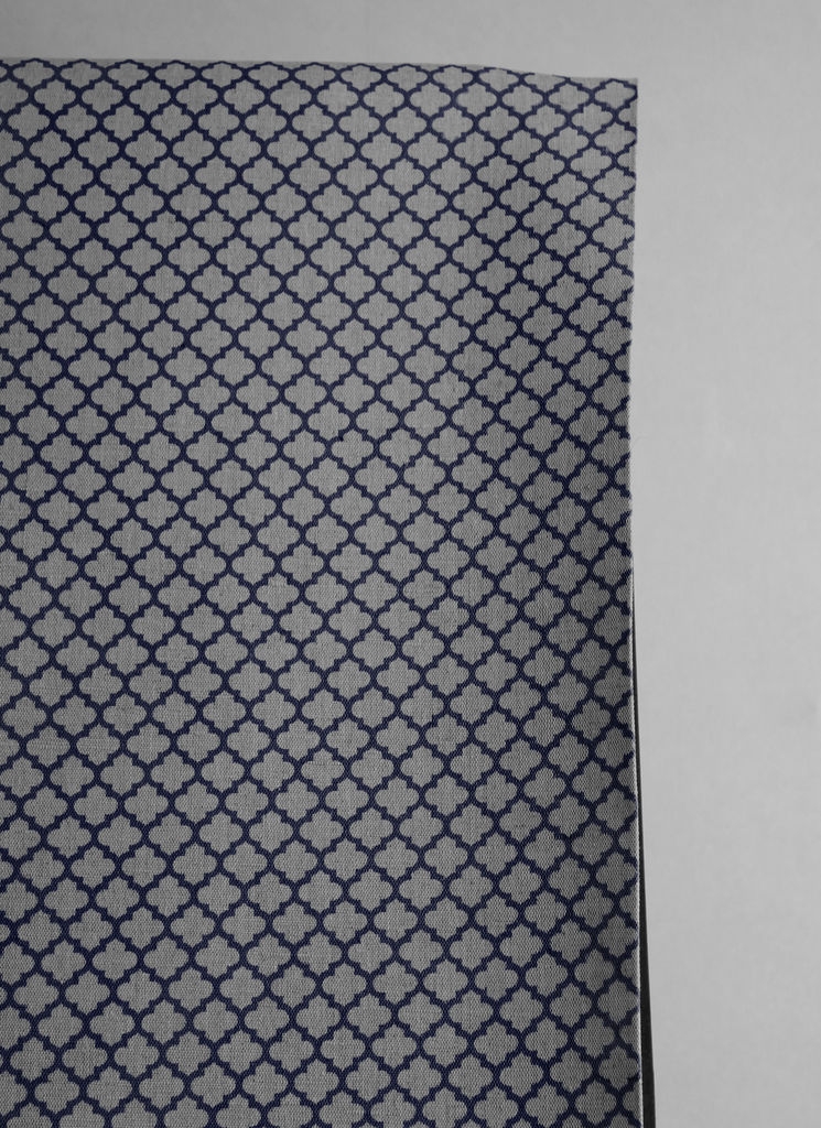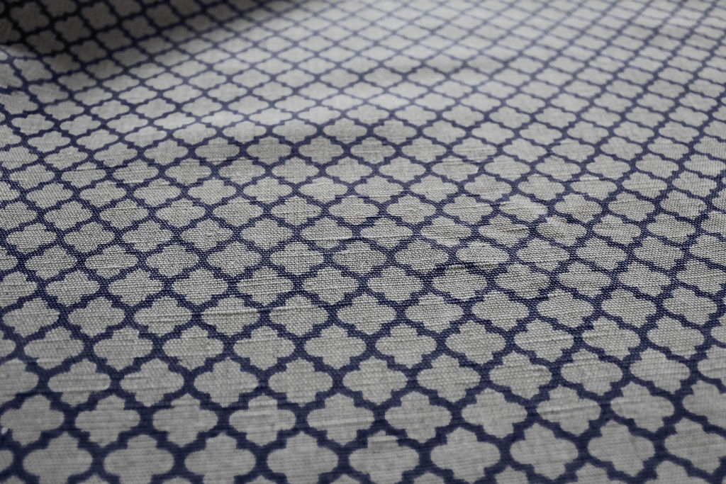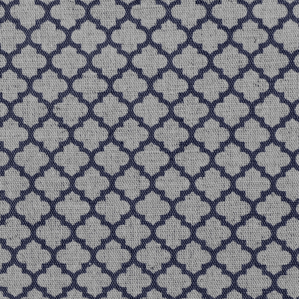 Natural Linen Cotton fabric printed with a dark blue moroccan clover pattern. Medium weight fabric.