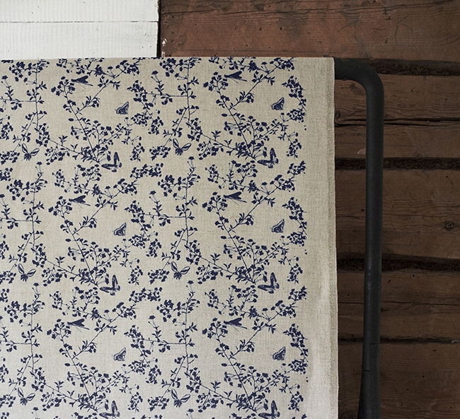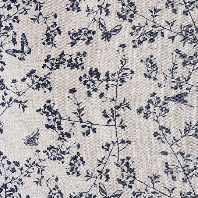 Kamille Deep Blue is a Natural Linen Cotton fabric with Dark Blue pattern with flowers and butterflies. Medium weight fabric.