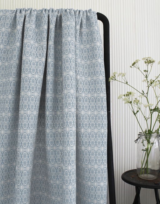 White 100% Linen fabric printed with Blue abstract print. Medium weight fabric.