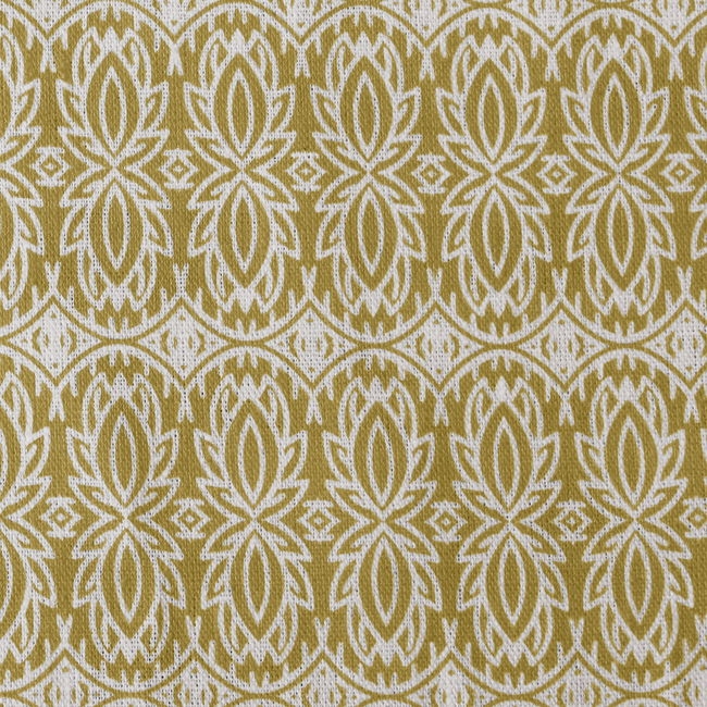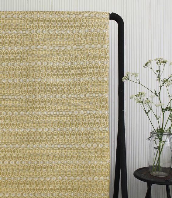 White 100% Linen fabric printed with Yellow abstract print. Medium weight fabric.
