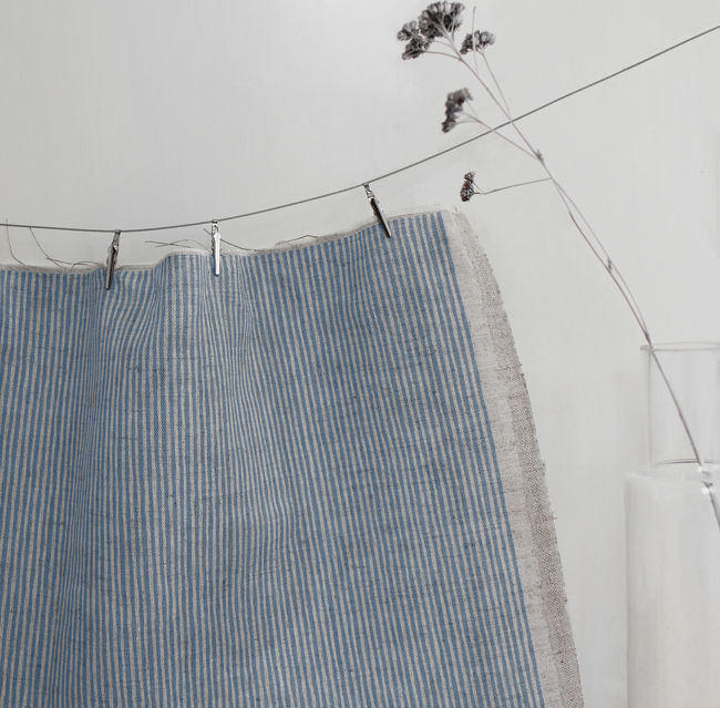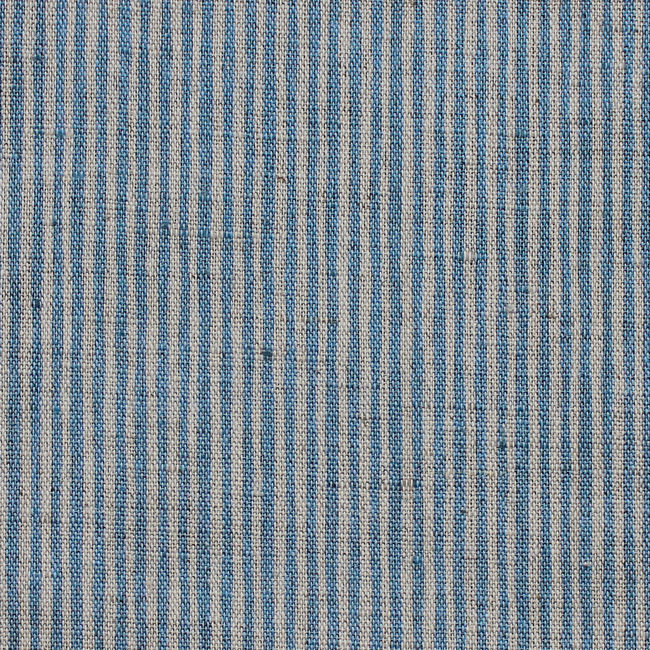 Natural Linen Fabric printed with Blue stripes. Medium weight fabric.