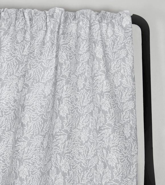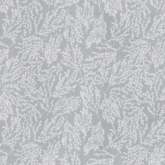 White Linen Fabric printed with Grey botanical print. Medium weight fabric.