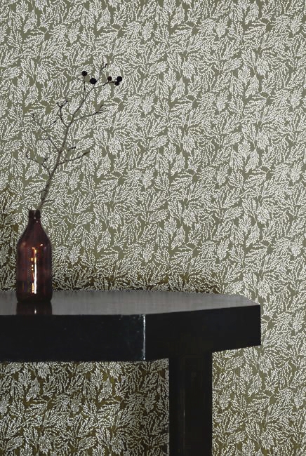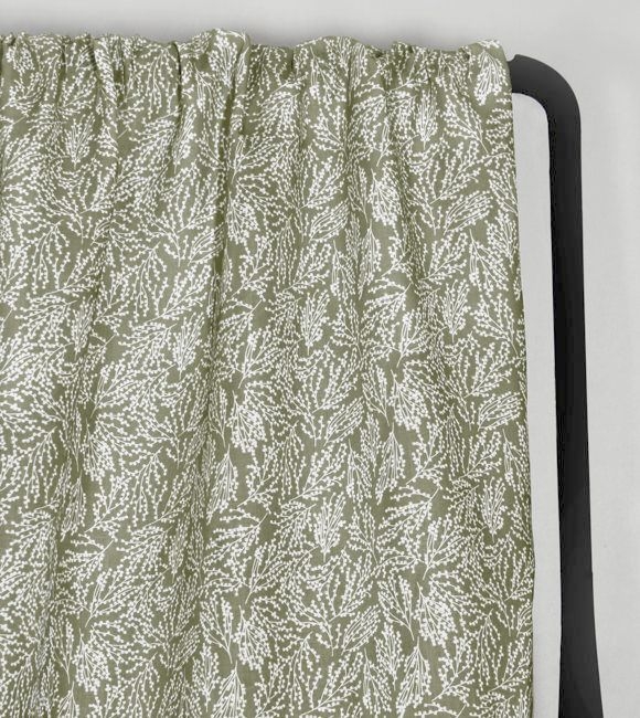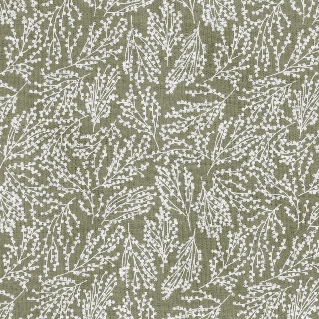 White Linen Fabric printed with Green botanical print. Medium weight fabric.