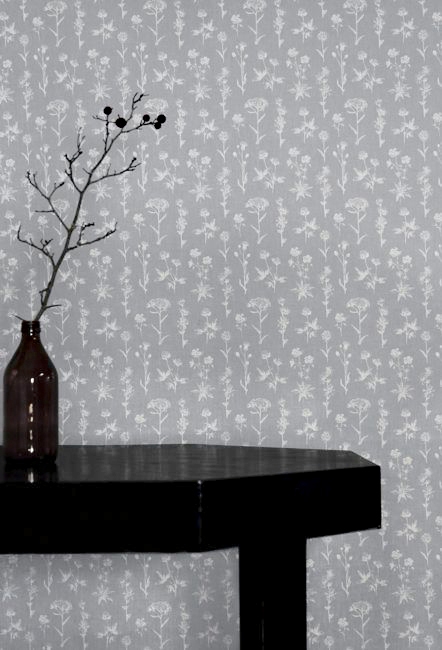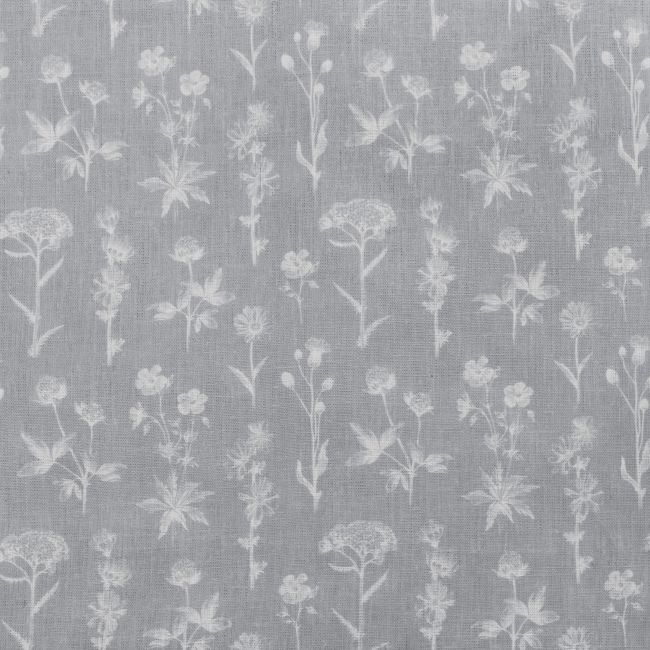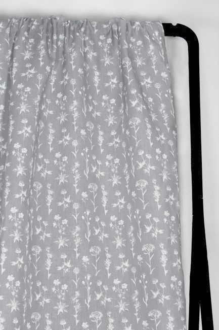 White Linen Fabric printed with Grey floral print. Medium weight fabric.