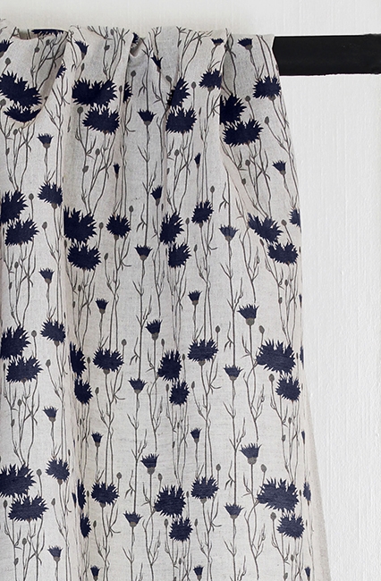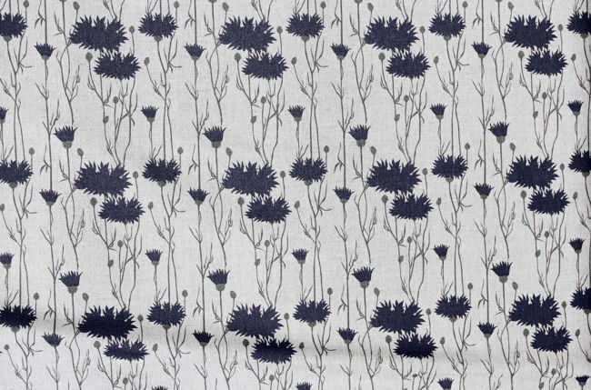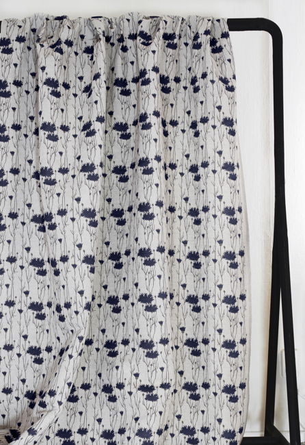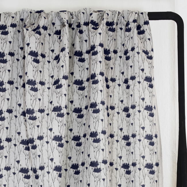 Natural Linen Fabric printed with Dark Blue and Grey floral print. Medium weight fabric.
