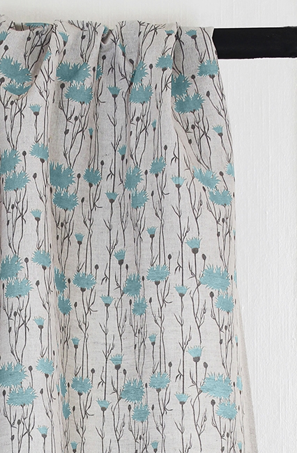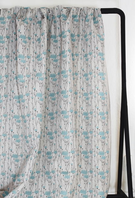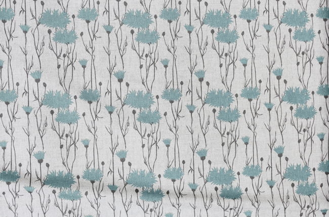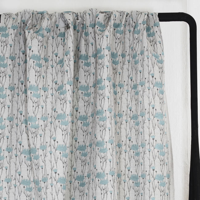 Natural Linen Fabric printed with Duck Egg Blue and Grey floral print. Medium weight fabric.