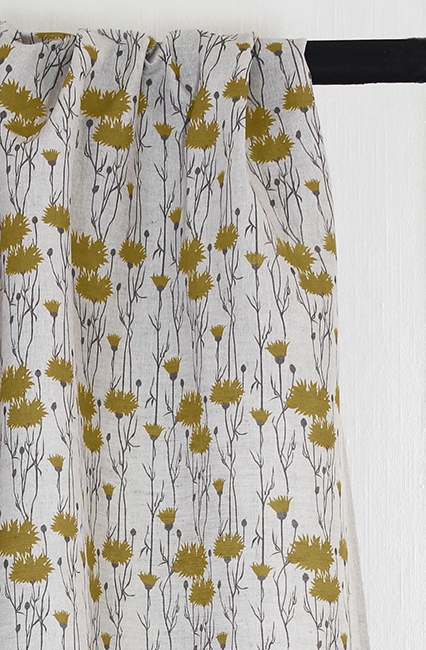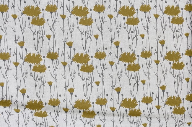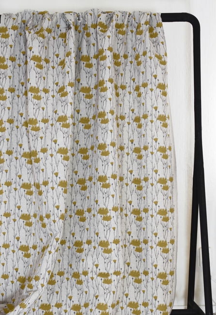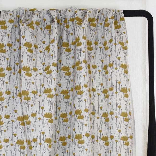 Natural Linen Fabric printed with Yellow and Grey floral print. Medium weight fabric.