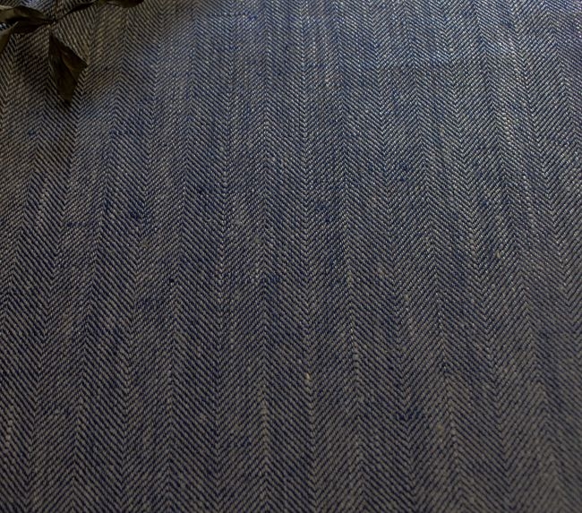 This 100% linen herringbone fabric is woven with two different colour yarns – indigo blue and natural linen. The colour is therefore interesting and fabric structure sifts light beautifully, so the colour looks different from different angles. The pattern is subtle and it makes this plain fabric more attractive and gives it more oomph.