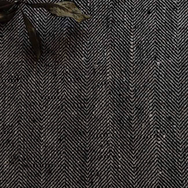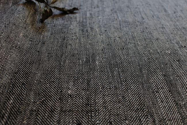 This 100% linen herringbone fabric is woven with two different colour yarns – black and natural linen. The colour is therefore interesting and fabric structure sifts light beautifully, so the colour looks different from different angles. The pattern is subtle and it makes this plain fabric more attractive and gives it more oomph.