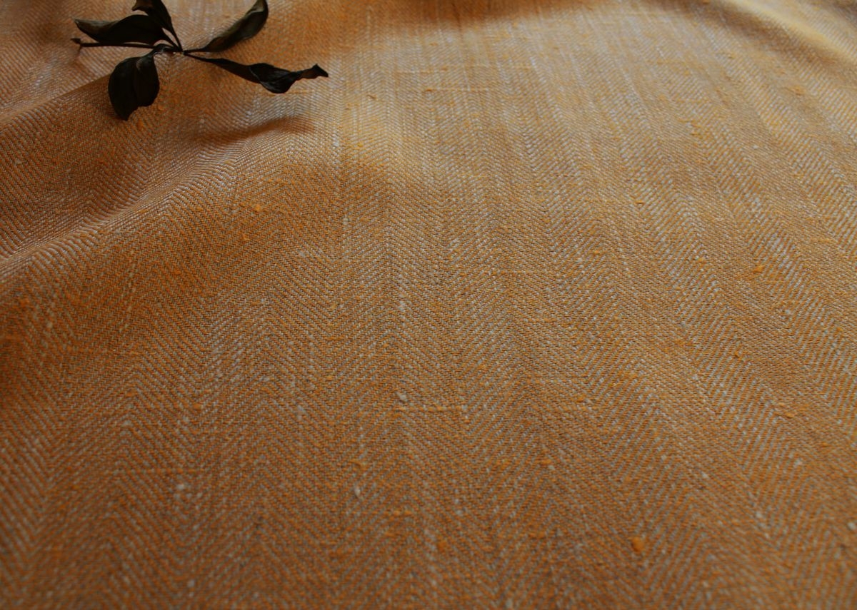 This 100% linen herringbone fabric is woven with two different colour yarns – tangerine and natural linen. The colour is therefore interesting and fabric structure sifts light beautifully, so the colour looks different from different angles. The pattern is subtle and it makes this plain fabric more attractive and gives it more oomph.